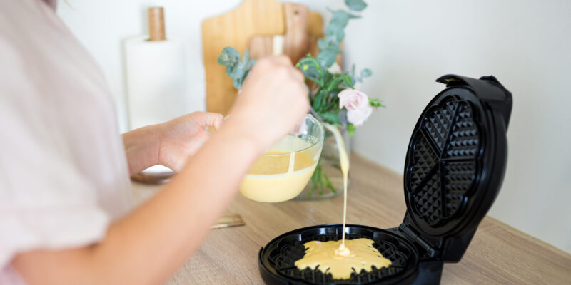 Amerikanska våfflor ligger ungefär mittemellan klassiska och belgiska våfflor – i alla fall när det kommer till tjockleken – och kan gräddas i ett helt vanligt våffeljärn, som detta från OBH Nordica. Det är egentligen själva toppingen som gör de “amerikanska”, det vill säga smöret, sirapen och florsockret.